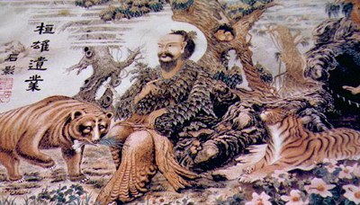 Hwagnung rodeado por la osa y tigre, evocan el mito de los orígenes de Corea.